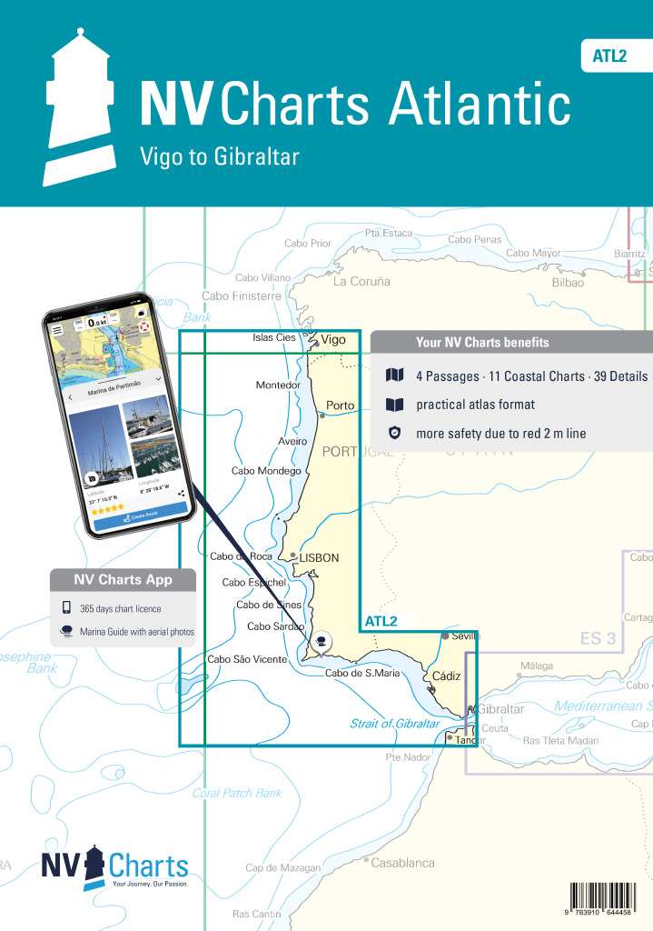 Met de NV Charts Atlantic Atlas ATL2 kunt u betrouwbaar navigeren van de Spaanse Atlantische kust tot aan de Straat van Gibraltar. Dankzij de duidelijke lay-out kan de recreatieve schipper snel aanvaarroutes, havens en ankerplaatsen vinden en wordt hij geïnformeerd over navigatorisch belangrijke details die ook in de NV Charts app verschijnen. De kaartenserie maakt indruk met zijn optimale afmetingen en uitgebalanceerde bladsecties.