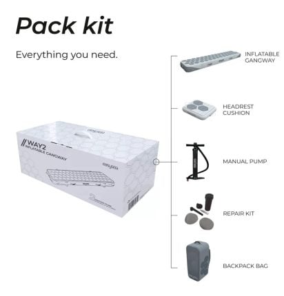 Wanneer de Way2 loopplank is opgevouwen in de meegeleverde rugzak, neemt hij slechts 0,03 m³ in beslag — dat is kleiner dan een gemiddelde handbagagekoffer. Met de bijgeleverde handpomp blaas je de loopplank binnen 4 minuten op tot een stabiele harde loopplank.