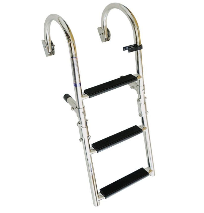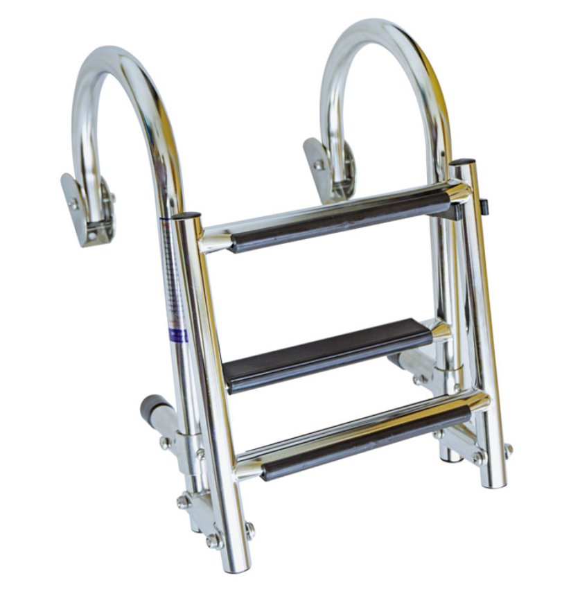 Mooie en stevige klapbare zwemtrap van RVS. Voorzien van anti slip tredes en uithouders. Bedoeld voor horizontale montage op bijvoorbeeld het dek of de steiger. Ook beschikbaar in verticale montage, klik daarvoor hier. De breedte van de trap is 205mm en de buisdiameter 25mm. De trap is beschikbaar in een versie met 3, 4 of 5 tredes. Bestel deze stevige zwemtrap of kom langs om hem te bekijken in onze winkel in Leiderdorp!